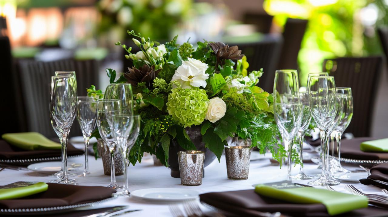 Les fleurs fraîches et les plantes vertes constituent des éléments essentiels pour une décoration naturelle réussie. Dans le cadre d'un thème chocolat et vert anis, privilégier des végétaux aux nuances vertes permet de renforcer la cohérence chromatique tout en apportant texture et volume. Le centre de table peut ainsi s'articuler autour de compositions florales généreuses où dominent les feuillages luxuriants, agrémentés de touches fleuries dans des tons blancs ou crème pour créer des points lumineux. Le blanc ivoire, couleur claire et rayonnante, sublime l'ensemble en faisant ressortir les tonalités plus soutenues. Les plantes aromatiques comme le romarin, la menthe ou le basilic peuvent également trouver leur place dans cette scénographie, apportant une dimension sensorielle supplémentaire avec leurs parfums délicats. L'utilisation de coupelles en métal pour accueillir ces compositions végétales ajoute une note contemporaine tout en permettant de jouer sur les reflets et les textures.